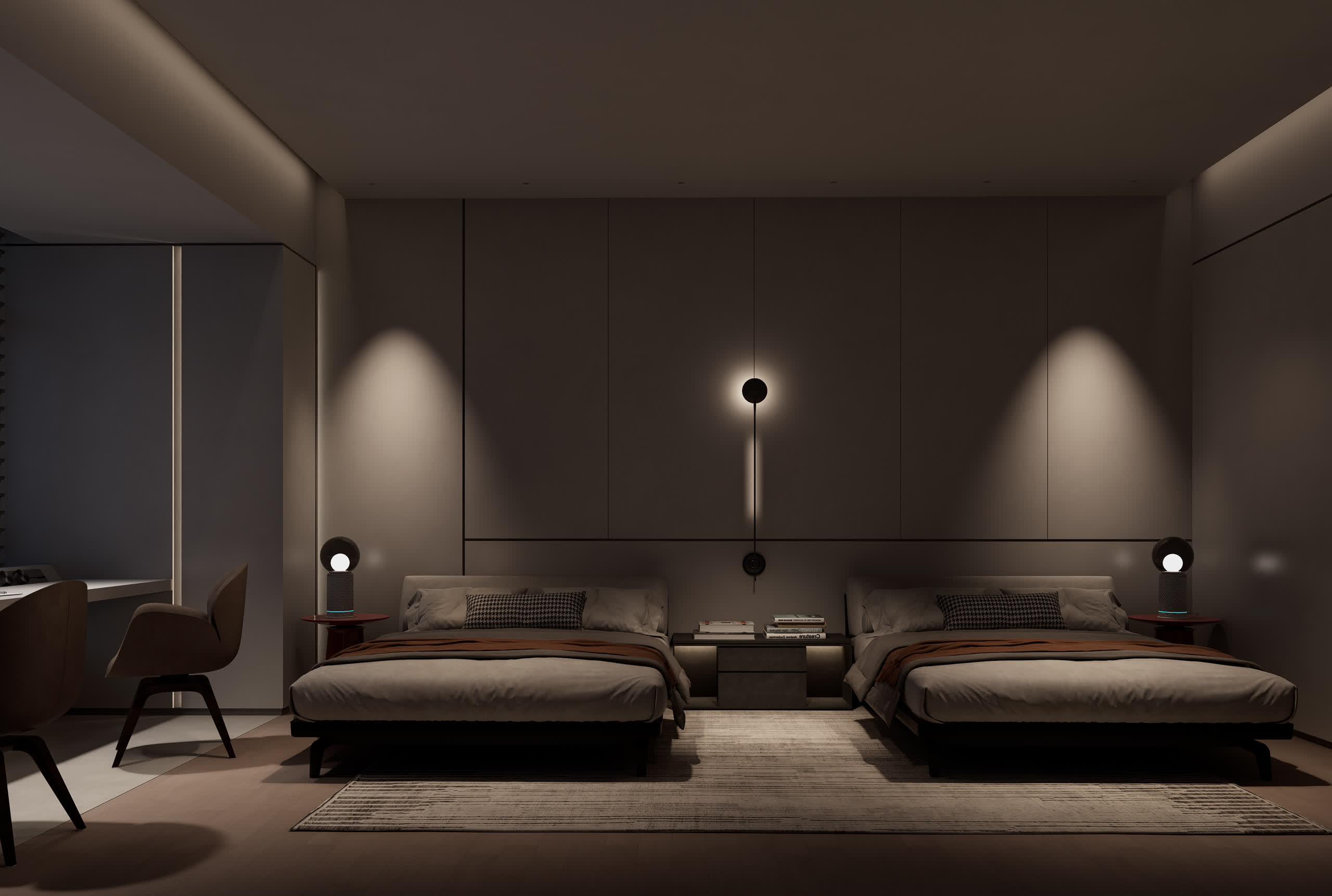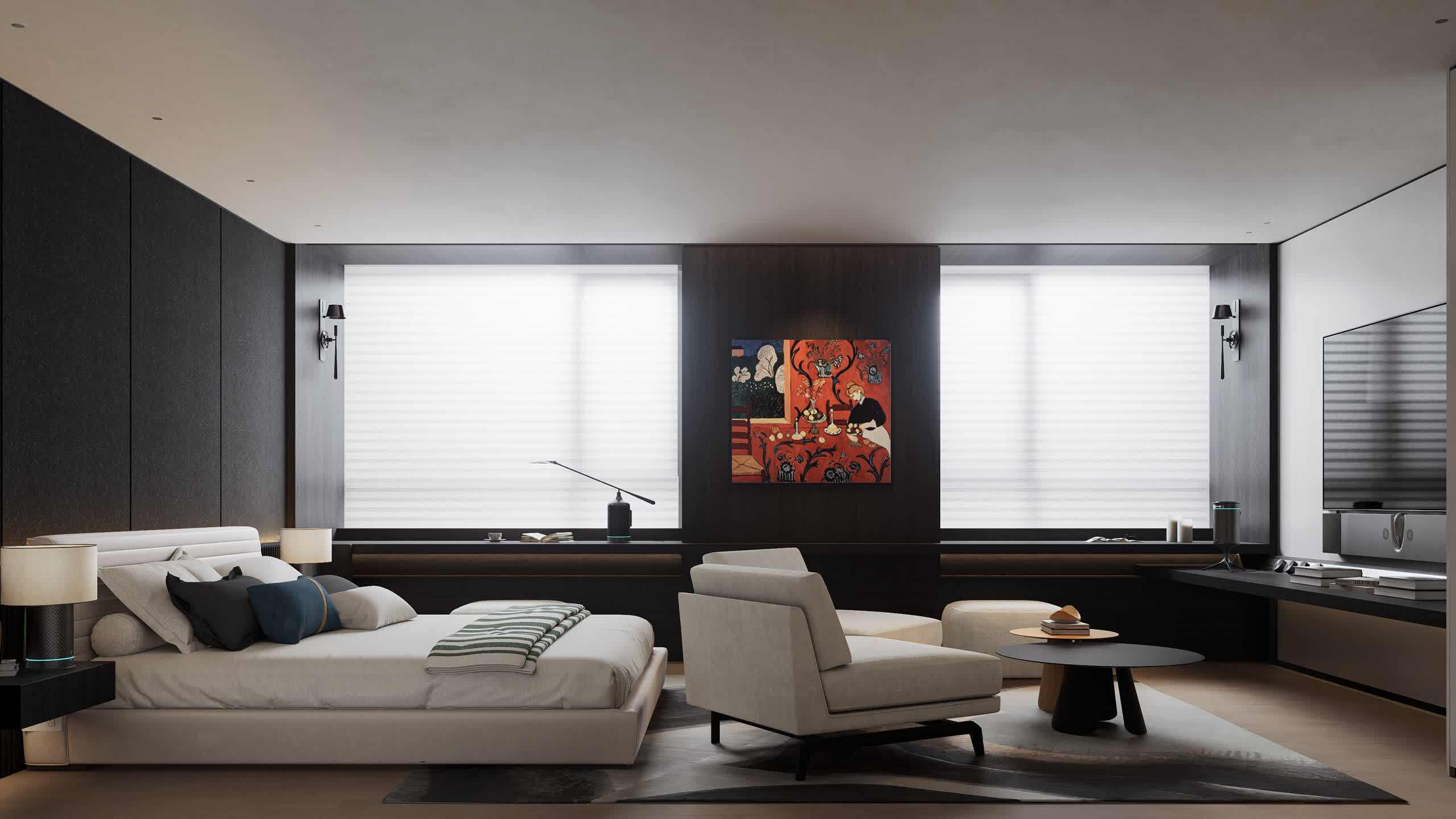 设计简约,外观大气,配一个大型木制床头系统,将床的软垫部分环抱其中。